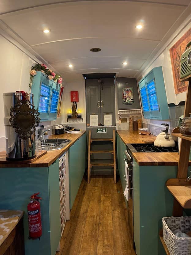 The boat’s interior is themed in a Cuban motif, complete with colorful artwork, cozy furniture, and a tiki-style cocktail bar. It functioned exactly like a house, complete with a full kitchen and a gas stove. The only difference was the entrance, which was a hatch rather than a door, and a water pump in the shower to drain the water.