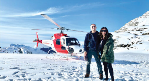 “Hey sweetheart, how about a helicopter ride?” I said to Teresa, shocking the pants off her. I’m not prone to splurges and it would cost $200 each for the 25-minute round trip. But this was a once-in-a-lifetime chance to fly over a glacier and touch down right at the top.