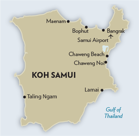 At its widest point, Samui is 16 miles across, the interior a dense jungle with rugged mountains. (The highest point is Khao Pom, 2,100 feet above sea level.) The island is encircled by 35 miles of “Ring Road,” also known as Route 4169. If traffic permits, you can drive around it in an hour.